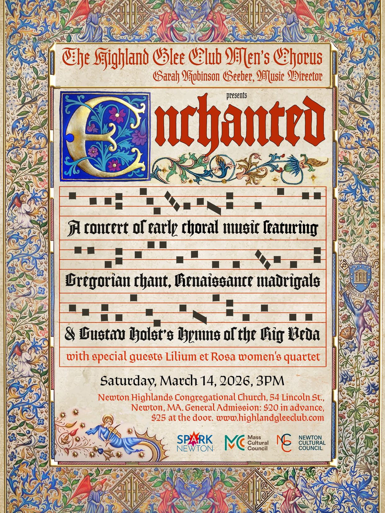 The limits of time and space disappear as you lose yourself in the mystical beauty of ancient chants, motets, and madrigals. As part of this very special and unique concert, the men of the Highland Glee Club are proud to partner with Lilium et Rosa, an enchanted women's vocal quartet in the style of Anonymous4. Lilium et Rosa is Megan Sheehy, Lena Costello, Rachael Foster, and Dana Sheridan.