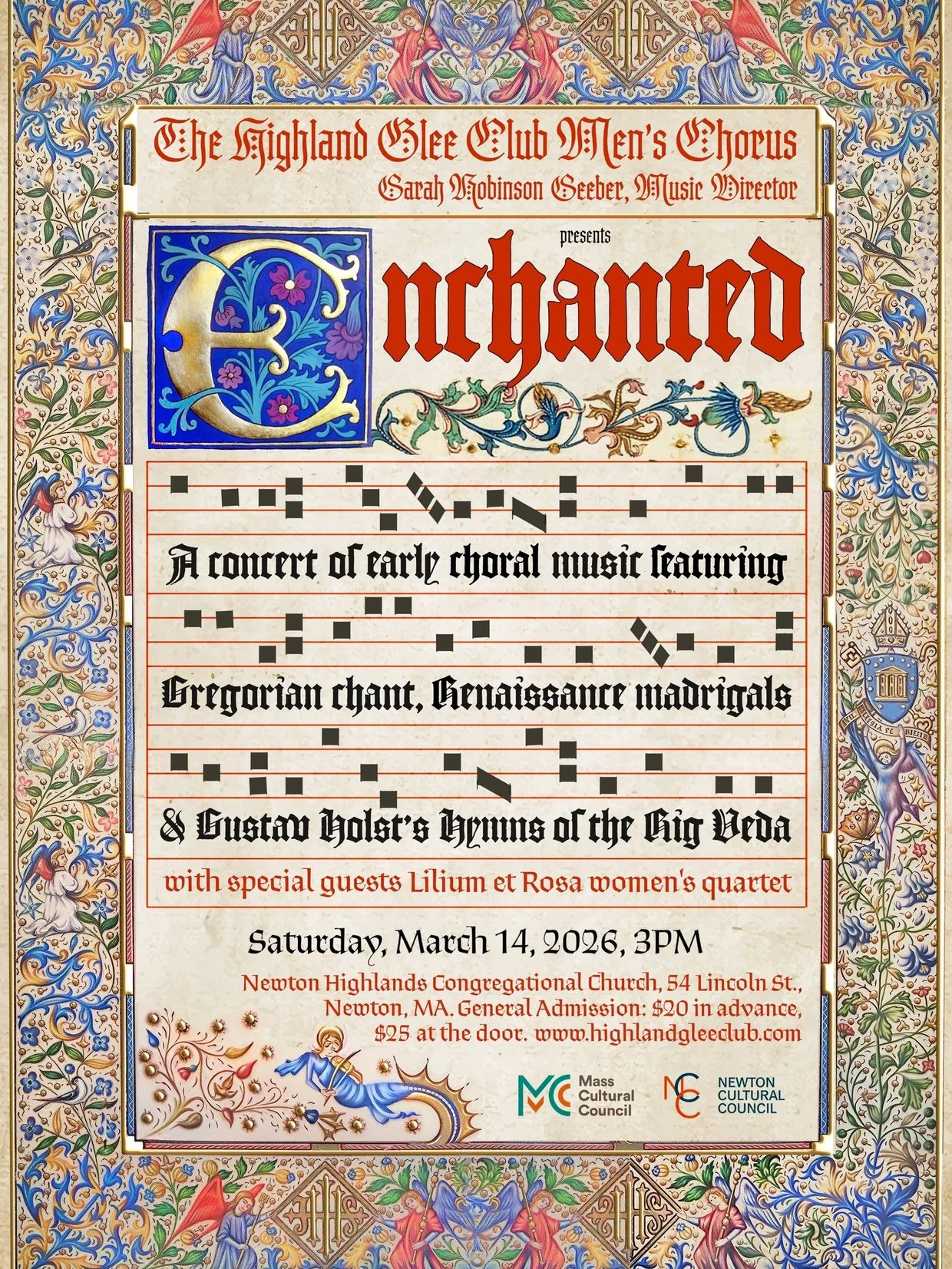 The limits of time and space disappear as you lose yourself in the mystical beauty of ancient chants, motets, and madrigals. As part of this very special and unique concert, the men of the Highland Glee Club are proud to partner with Lilium et Rosa, an enchanted women's vocal quartet in the style of Anonymous4. Lilium et Rosa is Megan Sheehy, Lena Costello, Rachael Foster, and Dana Sheridan.